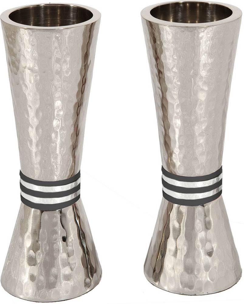 Conical Shaped Candlestick set. A unique new addition to our Shabbat Collection. A beautifully simple style for a display of elegance at parties or ritual use, the hand hammered detailing give it additional charm. The rings on the bottom of the candlesticks adds personality to your table! Also available in with Multicolor, Silver, Blue and Red rings. Measures: 5.5" x 2".